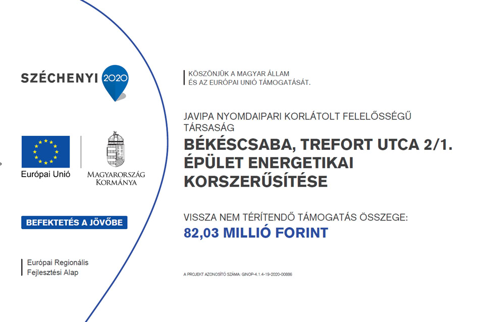 A Széchenyi 2020 program „Megújuló energia használatát, energiahatékonyság növelését célzó épületenergetikai fejlesztések támogatása” című felhívásán 82,03 millió forint vissza nem térítendő európai uniós támogatást nyert el a JAVIPA Nyomdaipari Kft. A 149,14 millió forint összköltségű projekt keretében a békéscsabai vállalkozás a Trefort utca 2/1. szám alatti épületének energetikai korszerűsítését valósította meg.